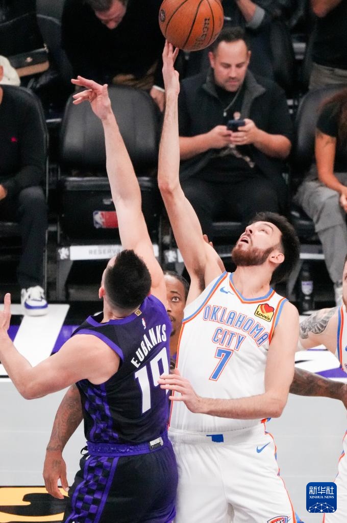 11月7日,雷霆队球员切特·霍姆格伦(右)和国王队球员德鲁·尤班克斯(左)开场跳球。