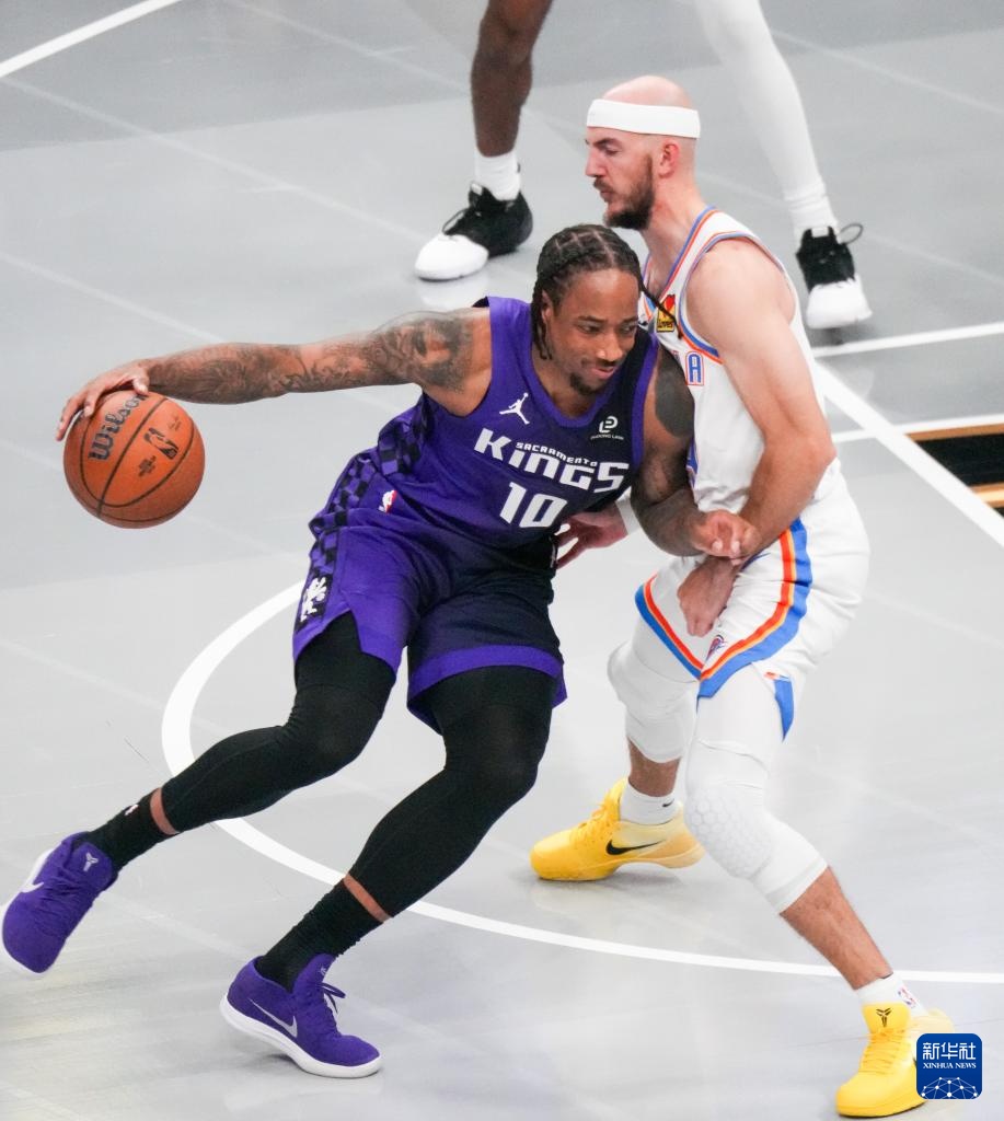 11月7日,雷霆队球员切特·霍姆格伦(左)在比赛中防守国王队球员德罗赞的上篮。
