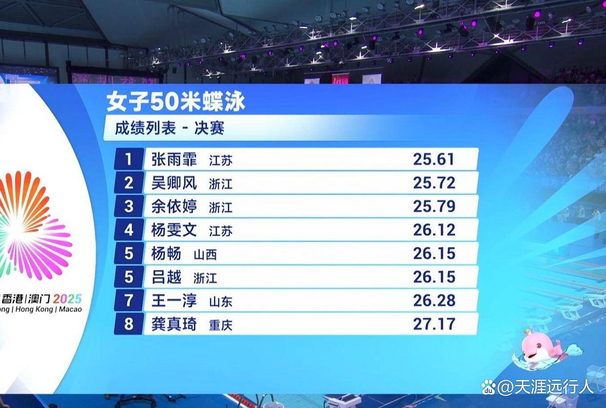 在游泳项目中,香港、浙江、江苏、湖北、河北各取一金。香港选手何甄陶在男子50米自由泳比赛中,力压名将潘展乐,为香港游泳队夺得第三枚金牌。名将张雨霏则在女子50米蝶泳比赛中,收获了个人在本届全运会上的第二枚金牌。