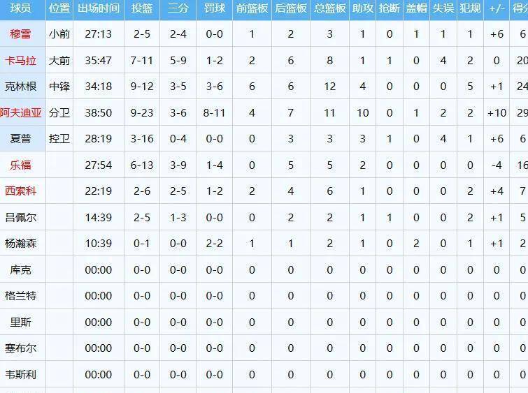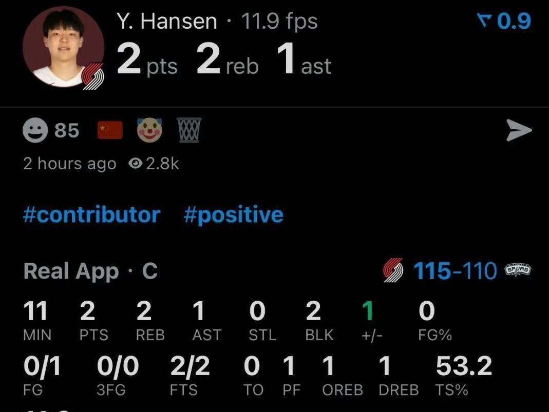 这场比赛的最终比分定格在115比110,开拓者爆冷击败了赛前高居西部第二的马刺队。 杨瀚森替补出战了11分08秒,投篮1次未能命中,但通过两次罚球得到2分,抢下2个篮板其中一个是前场篮板,送出了1次助攻和2次盖帽。 他的盖帽数在全队排名第一,正负值为 5。