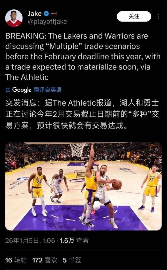 据了解,湖人和勇士在交易截止日前商讨多种交易方案,预计一项交易很快就会达成。