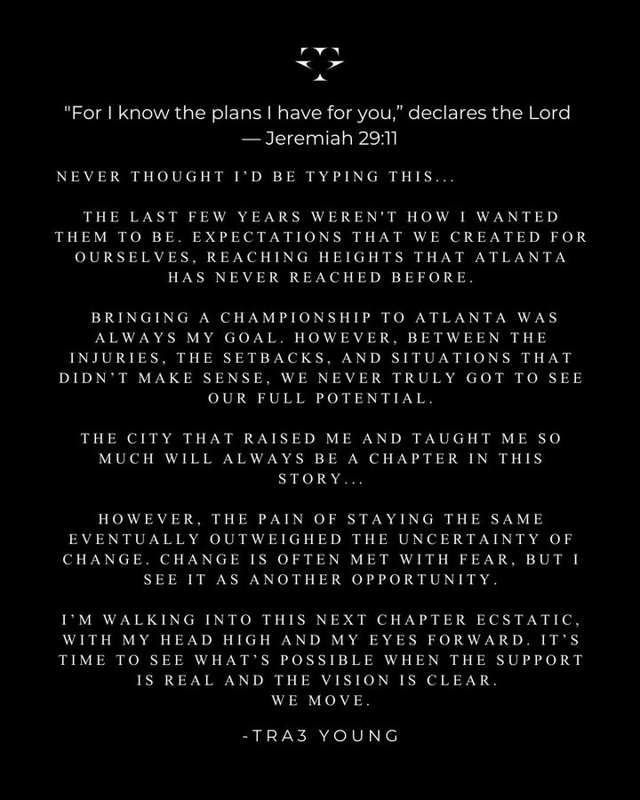 特雷-杨写道:“为亚特兰大带来总冠军一直是我的目标。然而,伤病、挫折以及种种不合理的情况交织在一起,我们始终未能真正发挥出全部潜力。这座培养我、教会我很多东西的城市,永远会是我人生故事中的重要一章。”